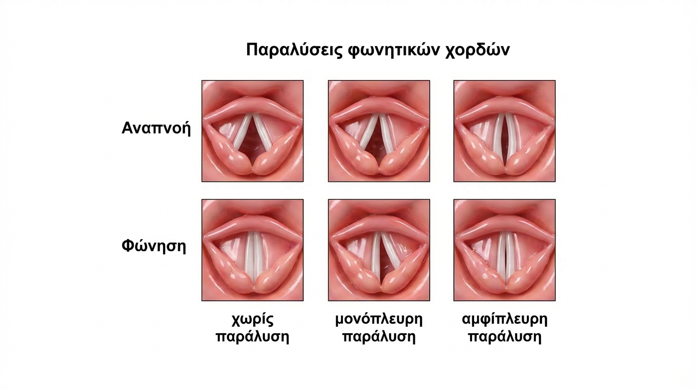 Αντίθετα, στην αμφοτερόπλευρη παράλυση, η φωνή μπορεί να παραμένει σχεδόν φυσιολογική επειδή οι χορδές βρίσκονται κοντά η μία στην άλλη, αλλά το κύριο πρόβλημα μετατοπίζεται στην αναπνοή. Ο ασθενής παρουσιάζει σοβαρή δύσπνοια και εισπνευστικό συριγμό, μια κατάσταση που απαιτεί άμεση ιατρική παρέμβαση για τη διασφάλιση του αεραγωγού.